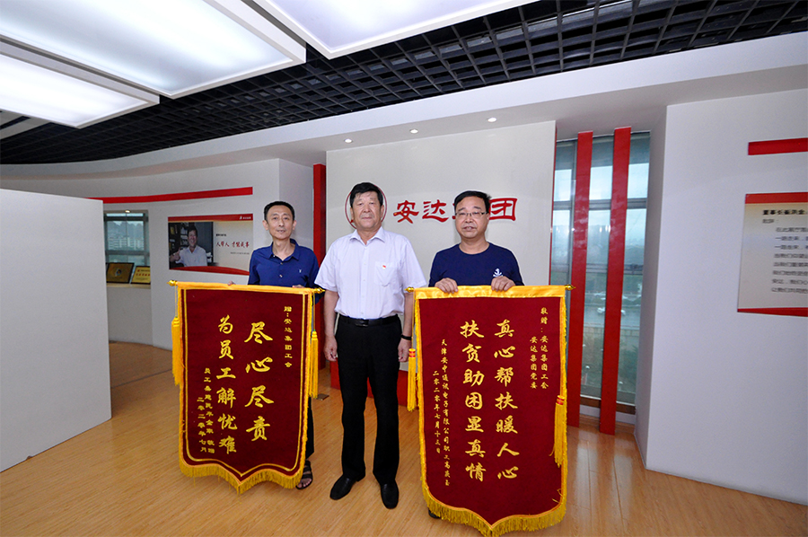 8月24日,鸿达精工机械有限公司职工桑建民、安中通讯电子有限公司职工高庆玉,作为困难职工代表来到安达集团,分别将绣有“真心帮扶暖人心,扶贫助困显真情”,“尽心尽责,为员工解忧难”的锦旗送到了安达集团党委书记、董事长崔洪金,工会主席郑宝彦的手中,感谢安达党委、工会对他们的真心关怀和帮助。