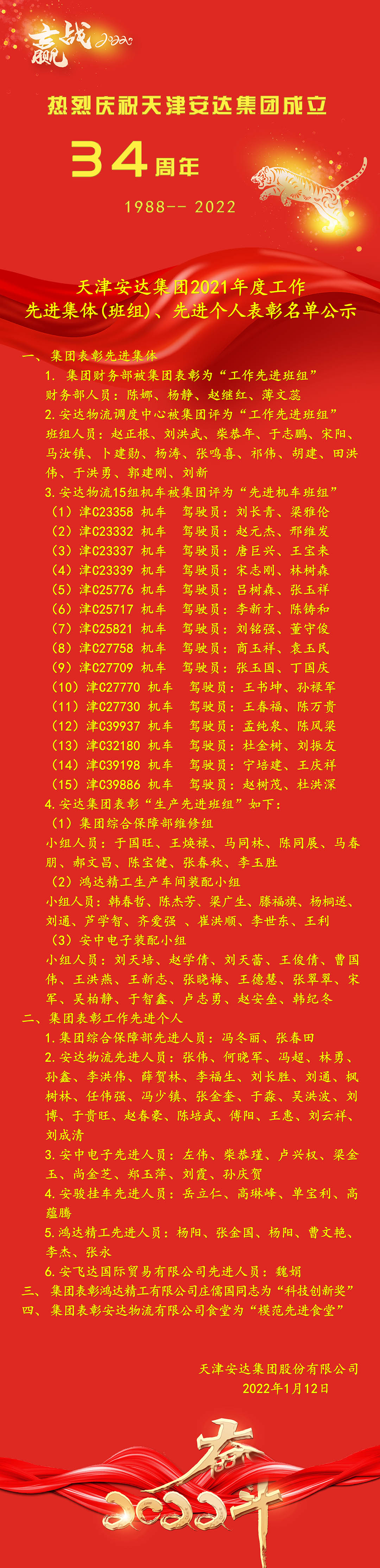 现将表彰的先进集体和先进个人进行公示,望所有受表彰人员能够再接再励,再创佳绩。展望2022年,将是强化改革、战胜疫情的转折之年,更是夯实基础、强力发展的关键之年。安达集团将面临机遇,迎接挑战,希望广大党员和职工群众团结一致、紧抓机遇,激励斗志、提高效益,结合国家发展战略,促进企业稳步发展。
