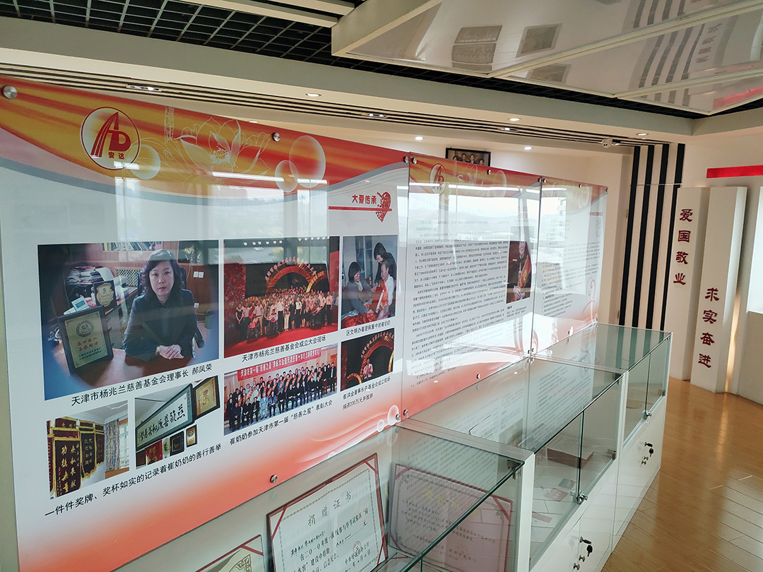 随后在五楼文化展厅,崔董事长把重点聚焦到慈善老人崔奶奶身上,作为崔洪金和崔洪英两位董事长的母亲,崔奶奶乐善好施,大爱无疆的美德完全传承到了两位董事长身上,并得到了更大发扬。崔洪金董事长常说:父母之恩,厚如高山,深似大海,父母给了我们生存的权利和拥有的一切。他曾是一名军人,深受母亲的影响和教诲,能将安达集团做到今天,并成立了以母亲命名的“天津市杨兆兰慈善基金会”。通过杨兆兰慈善基金会继续将母亲的善举大爱延续传承,持续帮助到更多困难家庭,残疾人士,进一步推动天津市慈善事业发展。同样圣发集团崔洪英董事长也是为了完成母亲的遗愿,建立了天津杨兆兰养老院,为敬老爱老的路上一直传承这份大爱。