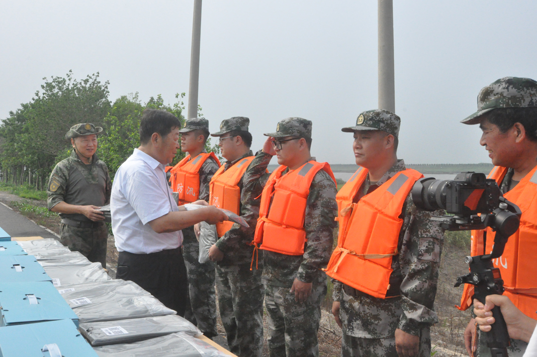 崔洪金现场了解民兵生活、排险情况,向坚守河堤的民兵表示崇高敬意,并为民兵送上夏季训练服装和防暑降温慰问品,对他们发扬“闻‘汛’而动、听令而行、勇于奉献”的精神高度赞扬。