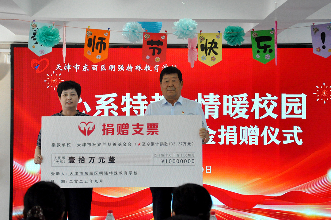 随后的捐赠仪式上,崔洪金代表天津市杨兆兰慈善基金会,将 10 万元教师专项改善资金交付明强特殊教育学校校长尚俊歆手上。尚校长表示该笔资金将精准用于教师发展基金,支持教师参与特教专业培训、教研交流活动,为教师成长赋能。为表感谢,尚校长向崔洪金董事长赠送锦旗。