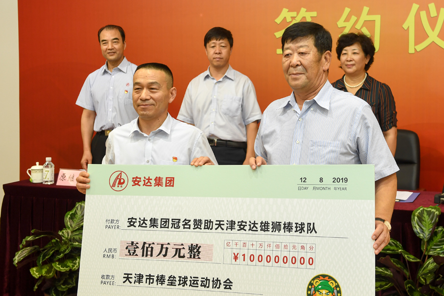 签字仪式上,首先由天津市安达集团股份有限公司党委书记、董事长崔洪金和天津市手曲棒垒球运动管理中心党总支副书记、主任黄清海在赞助协议上签字。手曲棒垒球运动管理中心副主任焦益代表天津雄狮棒球队向崔洪金赠送球队全体成员签名球衣;原继祖代表安达集团向天津棒球队赠送礼品。